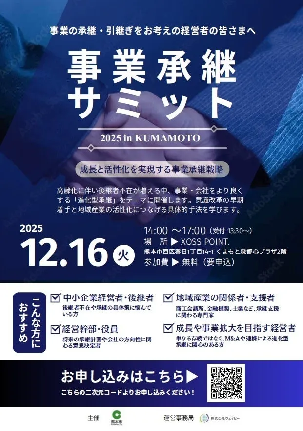 来る2025年12月16日、熊本市で「事業承継サミット2025」が開催されます。このサミットは、中小企業の経営者や後継者を対象に、事業承継に関する最新の情報や成功事例を共有し、互いに学び合う場となる予定です。