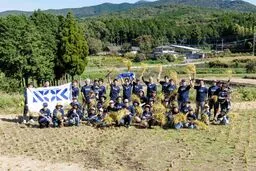 10月11日、熊本県阿蘇市にあるNOK熊本事業場は、地域の地下水保全活動の一環として「水田オーナー制度」の稲刈りイベントに参加しました。この日の参加者は社員やその家族を含む50人で、地域の生産者と共に、菊池郡大津町の水田で稲を刈りました。