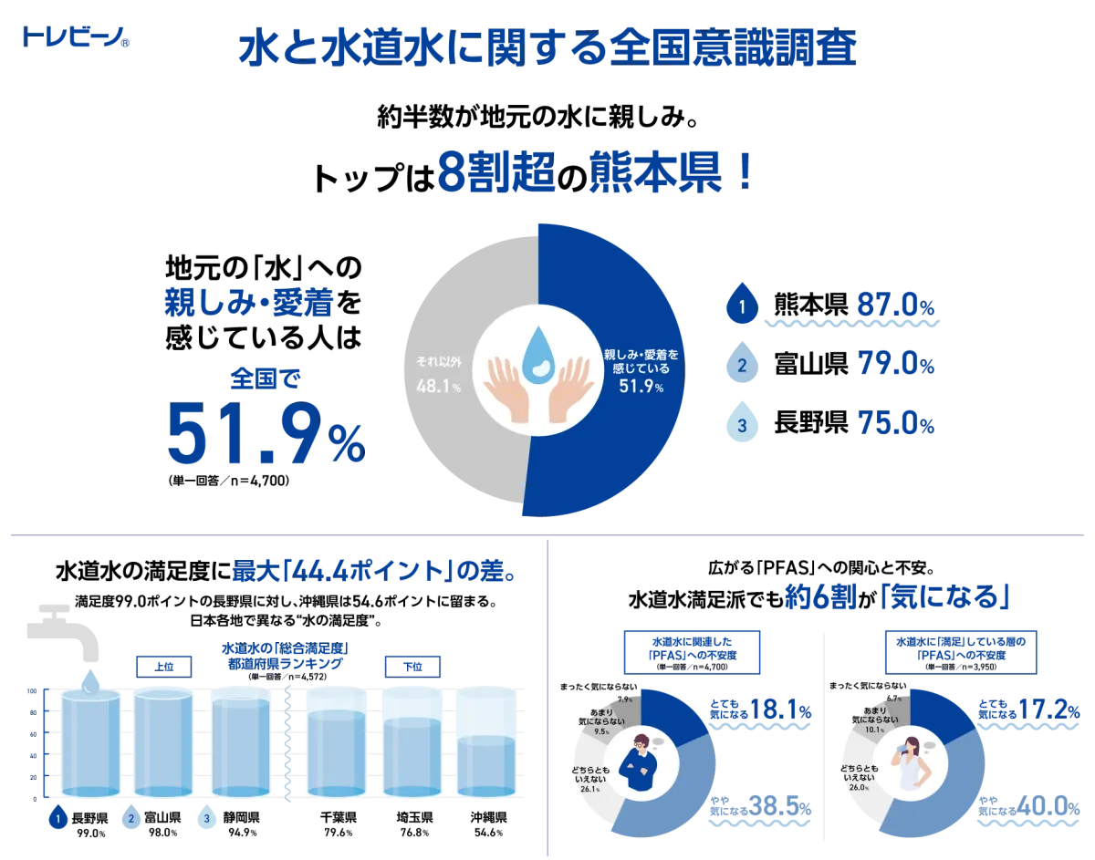 今回の調査結果は、地域ごとの水への親しみ方や水道水に対する意識を明らかにしました。熊本県の住民の高い親しみ度は、豊かな自然環境と名水のブランドが一因であることが分かります。また、これからの水道水の安全性に対する関心がますます重要になってくることでしょう。トレビーノ®は、これからも安心しておいしい水を提供し続けていくことを目指しています。