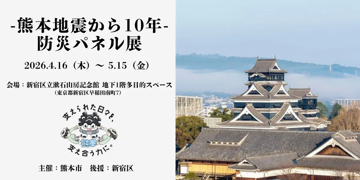熊本市が遂行する「-熊本地震から10年-防災パネル展」が、令和8年4月16日から5月15日まで、東京都新宿区の漱石山房記念館で開催されます。この展覧会は、熊本地震からの10年間の歩みを振り返りつつ、文化交流を通じた防災意識を高めることを目的としています。